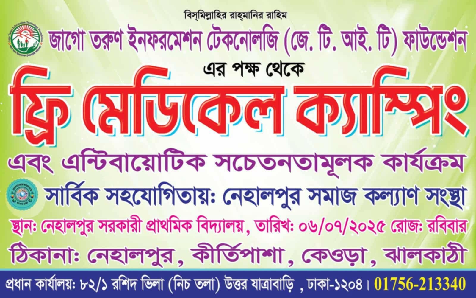 আগামী ০৬ জুলাই ২০২৫, রবিবার, দিনব্যাপী এই কর্মসূচিটি অনুষ্ঠিত হবে নেহালপুর সরকারি প্রাথমিক বিদ্যালয় চত্বরে, যেখানে এলাকার সাধারণ মানুষ বিনামূল্যে স্বাস্থ্যসেবা, ওষুধ এবং চিকিৎসকদের পরামর্শ পাবেন। বিশেষভাবে গুরুত্ব দেওয়া হবে এন্টিবায়োটিক ব্যবহারে সতর্কতা ও সচেতনতার উপর।