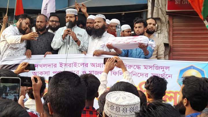 এই বিক্ষোভ মিছিলে অংশ নেন ও বক্তব্য রাখেন মাওলানা আবুল কালাম আজাদ ,আরো বক্তব্য রাখেন মাওলানা আনোয়ার হোসাইন ,নুরে আলম নয়ন সিদ্দকী , মকবুল মুন্সি সহ আরো অনেকে বক্তব্য রাখেন । তারা প্ল্যাকার্ড, ব্যানার ও ফিলিস্তিনের জাতীয় পতাকা হাতে নিয়ে ‘ফিলিস্তিনের শিশু হত্যার বিচার চাই, (ইসরায়েলি সন্ত্রাসী হামলা- বন্ধ করো, করতে হবে’ সহ, নানা স্লোগান দেন।